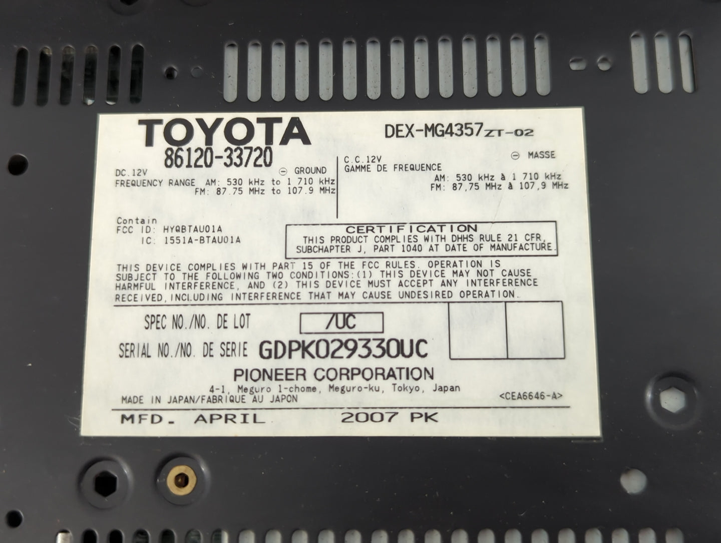 | LEXUS ES350 07-09 receiver, ID P1807 on radio face | 2007 | Lexus | Es350 | Base Sedan 4-Door | 3.5L 3456CC V6 GAS DOHC Naturally Aspirated |